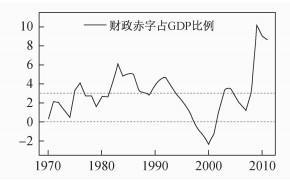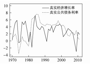 图 3为1970—2011年美国真实经济增长率与以CPI为基础的真实公共债务利率走势图①。20世纪70年代, 美国真实经济增长率一直高于真实公共债务利率; 但这种情况在80年代发生了转变, 整个考察期间, 总体上, 真实经济增长率低于真实公共债务利率, 这意味着未来债务比例有温和增长趋势, 从而债务可持续性将恶化。