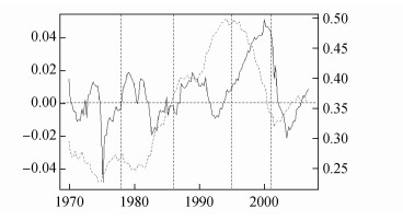 其中, βl(t)刻画了基本预算盈余对公共债务占GDP比例变化的时间效应。图 8显示半参数模型的估计结果, 调整后的R2为0.911, 高于线性和非参数估计结果, 估计精度有进一步的改善。图中两条虚线表示95%的置信区间, 实线表示估计系数的点估计结果。从图 8可以看出, 与线性模型估计结果中一直为正且较高的反应系数相比, 半参数模型中基本预算盈余对公共债务比例的反应系数在1980年代以前曾一度为负, 之后虽然经历了一个上升过程, 但2000年后一直呈下降趋势, 表明进入21世纪以来, 财政纪律及政府对稳定债务比例关注度的下降, 也意味着债务比例将有发散趋势, 从而公共债务是不可持续的。