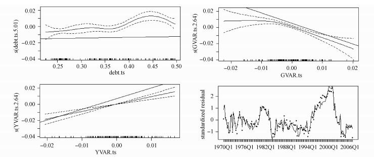 根据非参数估计结果, 债务比例的非线性较强, 政府支出和经济波动两个变量的非线性性不强。根据税收平滑理论, 财政赤字应用于弥补税收收入的下降, 这意味着无论从实证角度还是理论层面, 有理由假定政府临时支出和经济周期因素对基本预算盈余占GDP比例的影响不随时间变化, 这样通过半参数模型, 便可以专注于考察基本盈余和债务关系随时间变化的情况。为此, 将政府支出和经济波动变量设定为线性形式, 将基本盈余与债务关系设定为非线性关系。半参数财政反应函数模型为: