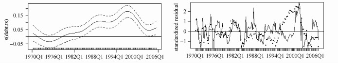 模型估计使用的计量软件是R 2.5.2, 估计结果见图 7, 调整后的R2=0.533, 高于线性模型估计结果, 同时相较于线性模型估计残差(散点), 非参数模型估计残差(实线)波动更小, 这些都显示与线性模型相比, 非参数模型更现实地刻画了基本盈余对公共债务变化的反应情况。估计结果显示, 基本预算盈余对公共债务比例的反应系数在债务比例较大区间内均为负, 只有在债务比例达到45%左右的小区间内为正; 从总体上看, 基本预算盈余对公共债务增加无正向反应或反应很微弱, 这意味着公共债务比例有发散趋势, 即公共债务不具有可持续性。