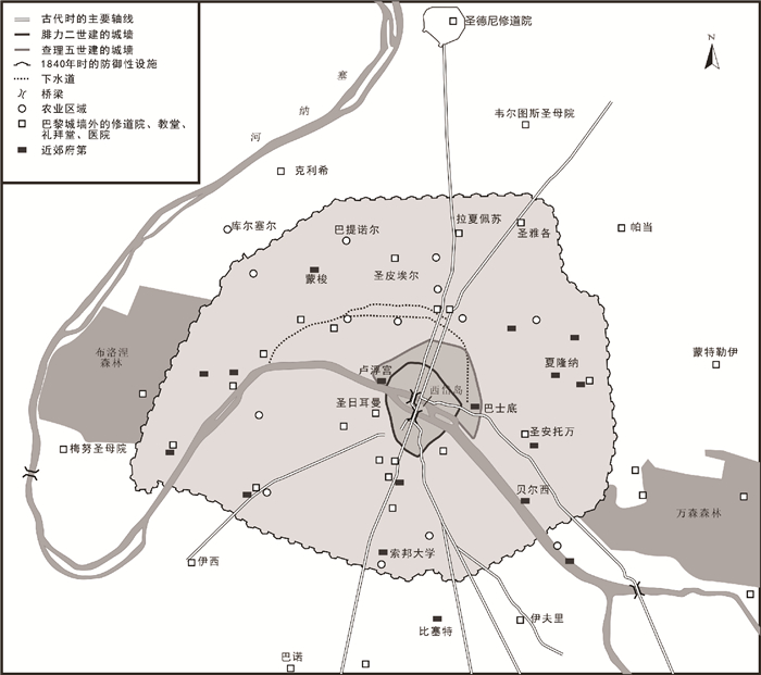 二 建造首都城市现实的政治需要决定了巴黎这座首都城市的面貌,巴黎的发展是与国王及其权力的巩固是分不开的,权力需要空间作为载体,而空间则推动了权力的增长。城市建设主要涉及防卫性城墙和王宫的修建。
