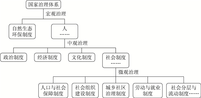从上述马克思社会结构理论的主要内容及其建构路径中我们可以大体看到,不同层次的结构要素状况是建构整个社会结构的关键。由于国家治理体系说到底是一种结构性要素的制度安排,因此,我们完全可以借助于马克思社会结构理论的指导,从不同层次的结构要素特征出发来构建整个国家治理体系。比如,根据要素关系原生性和派生性的不同,马克思把社会结构划分成宏观、中观和微观三个层次,而这三个要素结构层次恰好也构成了国家治理体系中的三个不同层次。因为国家治理体系和治理能力是一个国家的制度安排和制度执行能力的集中体现。从本质上来说,国家治理体系的构建就是一种结构性的制度构建,它至少包括横向的系统结构和纵向的层次结构两个方面。从横向的系统结构来看,其在中观层面上至少是由政治权力系统、市场经济系统、思想文化系统、社会组织系统、生态环境系统等结构要素(子系统)构成的一个有机整体,①且各要素之间彼此独立又相互联系。从纵向的层次结构来看,由于国家治理体系涉及社会结构的宏观、中观和微观三个不同层次,从而把国家治理体系分为宏观治理制度、中观治理制度和微观治理制度。宏观治理要素主要包括人与自然,主要表现为生态环境保护等方面的制度构建;中观治理要素是指横向的政治、经济、文化、社会四个不同系统的制度构建;微观治理要素则是指人口与社会保障、劳动与就业、社会分层与流动、社会组织、城乡社区等方面的具体社会制度的建构(参见图 1)。