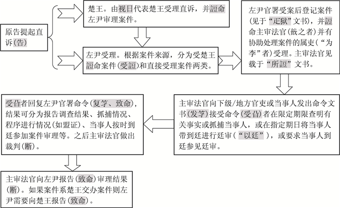 由上述卷宗标签的分析可以看到,在直诉案件中,楚王受理案件后并不直接审理案件,而是将其转给专职司法裁判的左尹处理,由此我们可以确认的是直诉于君王的案件的审理者仍是王廷所设的专门司法机构——左尹官署,其亦有审理君王交办案件的任务。