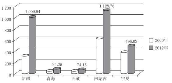图 1 2000—2012年我国西部省份家庭平均每人出售的粮食产量(单位:公斤) 数据来源:《中国统计年鉴》(2001,2013)。 |