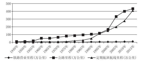 图 2 1949—2013年我国交通运输线路里程 数据来源:《中国统计年鉴》(1950—2014)。 |