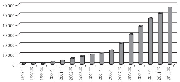 图 3 1997—2012年我国互联网上网人数(单位:万人) 数据来源:《中国统计年鉴》(1998—2013)。 |