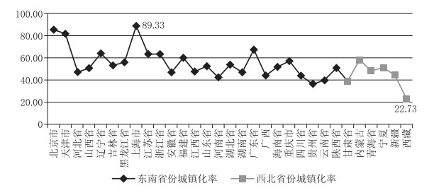 图 4 2013年我国各省份城镇化率② 数据来源:《中国统计年鉴》(2014)。 |