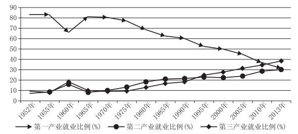图 5 1952—2013年全国三大产业就业比重 数据来源:《中国统计年鉴》(1953—2014)。 |