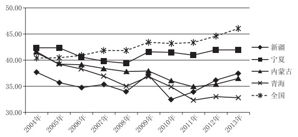 图 6 2004—2013年我国西部省份与全国第三产业比重对比 数据来源:《中国统计年鉴》(2005—2014)。 |