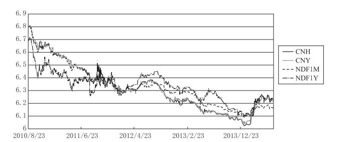 2013年以来,随着人民币结算便利化制度的实施和境外跨境人民币清算平台的相继建立,人民币离岸业务的基础设施得到不断完善,使之更好地促进了跨境交易中对外贸易投资和实体经济发展。跨境人民币结算金额从刚开始的2009年只有35.8亿元,到2014年前三季度已超过4.8万亿元,人民币已成为我国第二大跨境支付货币,人民币跨境收支占全部本外币跨境收支的比重已接近25%,货物贸易进出口的人民币结算比重则超过15%;与我国发生跨境人民币收付的国家达到174个(胡晓炼,2014)。境外NDF走势是境内外市场参与者管理人民币头寸和对冲风险的重要依据之一,因而CNH市场和CNY市场的即期汇率关联性依旧很强的同时,NDF远期汇率市场无论期限长短都是CNY市场的格兰杰原因,CNY即期汇率的变动对NDF一年期汇率变动具有引导性,反映了CNH为境内外市场中人民币汇率信息流的传递提供了载体,有利于人民币汇率形成及传导机制的完善。