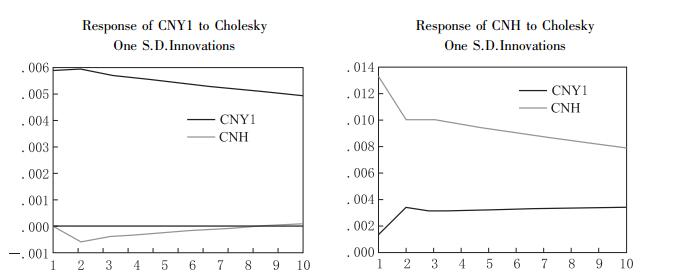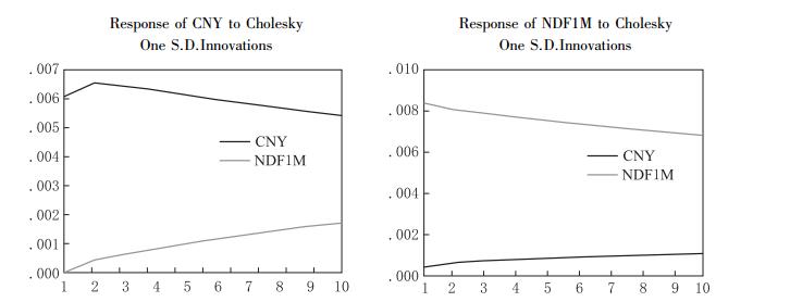 利用在VAR模型中得到的CNY即期汇率和NDF1M之间以及CNY1和CNH即期汇率之间的相互关系,可构建脉冲响应函数,以全面捕捉NDF市场和CNH市场对CNY市场的动态影响过程。表 9和图 2列示了CNY和NDF1M之间的脉冲响应方差分解表和合成图。