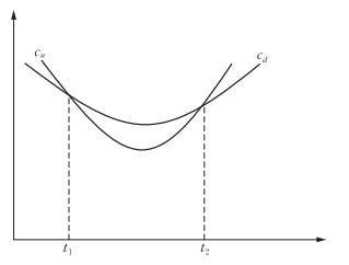 发达国家和发展中国家的资本充裕度、技术水平和劳动力素质不同,在产品价值链上的同一要素投入阶段生产单位产品的成本不同,形成两条交叉的价值链成本曲线(见图 1)。发展中国家的生产价值链上的成本曲线具有相对较大的斜率,与发达国家的成本曲线存在两个交点t1和t2,交点上发展中国家与发达国家最小生产成本相等cu=cd。就整个生产价值链而言,选择较低成本的结果就是,两段高附加值阶段(研发设计阶段、品牌营销阶段)在发达国家生产,而中间低附加值阶段(加工组装阶段)在发展中国家生产。对最小成本函数ci进行求导,并且两边除以最小成本ci,可以得到: