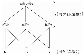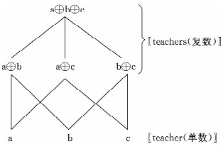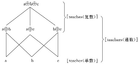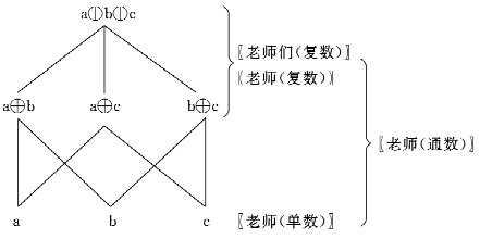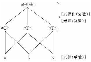 从图一的并原子半格结构,我们可以看出单数实际上是原子,而复数则是原子的相加。这是英语中单数和复数的情况,汉语的情况与此大致相同,如图二所示。
