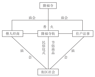隆福寺通过香火和庙会,伴随着一些民俗仪式融入街区社会,主要有僧人从事商业、隆福寺街商户、街区住户佛事活动等三种形式,其中整个空间围绕寺庙的宗教特殊性,又衍生出民俗仪式表演和节俗商业。寺庙、商业街和市民社会,形成了一个在政府管理背景下,僧商互动的民俗经济空间,呈现出“政府管理(皇室)——僧人(寺庙)——商人(商业街)”的社会结构关系。如下图:
