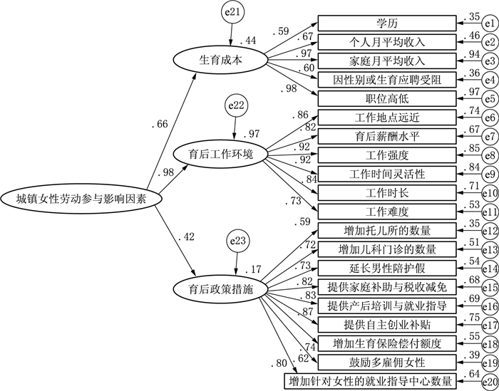 3. SEM模型。通过构建城镇女性劳动参与影响因素九级量表(见表 2),以其劳动参与为二阶潜在变量,生育成本、育后工作环境、育后政策措施为一阶潜在变量,共计20个程度变量构建结构方程模型,利用AMOS18.0运行得到标准化二阶模型路径输出图(见图 1)。