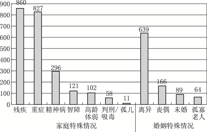 第一,低收入群体中重症、残疾、精神病、丧偶等非常态的家庭和婚姻状况突出,影响了家庭的稳定性和持续性。2008年调查的备注信息栏记录了婚姻和家庭特殊情况,我们整理后发现纳入模型的65 865份样本中,有2275户存在家庭特殊情况,其中860户家庭有残疾人,827户家庭有重症病人,所占比重分别为1.31%和1.26%;417户家庭有精神病或智障患者,占0.63%,远高于普通家庭发病率。③如图 1。实地调研发现,精神病和智障家庭往往有两个以上成员患病,重症家庭也有类似情况。纳入2011年模型的9362份样本中,有108户家庭存在特殊情况,其中重症37户、残疾50户、精神病或智障6户。2008年1.47%的家庭存在婚姻特殊情况,其中丧偶166户、孤寡老人64户。2011年18.75%的家庭存在婚姻特殊情况,其中高龄未婚135户、离异1 278户、丧偶330户。