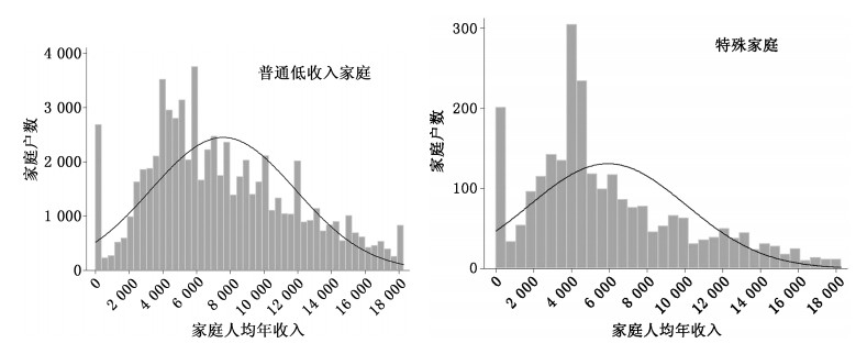 第二,低收入群体收入水平和受教育程度偏低。2008年的人均年收入均值为7 516元,未达到广州城镇居民人均收入的50%。图 2显示,普通低收入家庭人均年收入呈近似正态分布,收入集中在5 000—8 000元;重症、残疾等特殊情况家庭的人均年收入呈现正偏态,收入集中在3 000—5 000元。特殊家庭面临大额医疗费用支出和照顾病人的双重困境,容易陷入劣势累积的恶性循环。