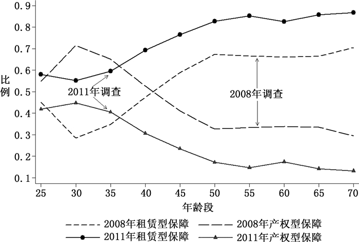 (二) 低收入家庭住房保障方式表 4显示,世代因素是住房保障需求类型的重要影响因素,从整体上看越早出生的世代选择产权型保障的概率越低,但并没有完全按照世代逐级递减,其中1956—1960年世代选择产权型保障的比率低于相邻世代。模型1显示,1956—1960年世代选择产权型保障的比率为0.325倍(e-1.125),低于1961—1965年世代的0.418倍(e-0.873)和1951—1955年世代的0.333倍(e-1.099)。各世代住房保障需求的差异,在很大程度上反映了不同世代的生命历程差异。以1956—1960年世代为例,该世代在生命历程的关键时点受到国家政策变动和重大社会事件的影响,是“刚生下来就挨饿,该上学就停课,该毕业就下乡,该结婚提倡晚婚,该工作就下岗”的一代(Hung & Chiu,2003;郭于华、常爱书,2005)。他们还经历了计划经济向市场经济转型的全过程,成为市场化改革代价的承担者。尽管该世代受教育程度较高,但在职业、收入、婚姻和住房上处于劣势。住房保障政策变动和房价上涨影响相应时期居民住房保障意愿,2008年调查世代的影响系数经历了由正到负的变化;2011年调查世代的影响系数均为负,说明2011年居民产权型保障意愿在生命周期内持续下降。