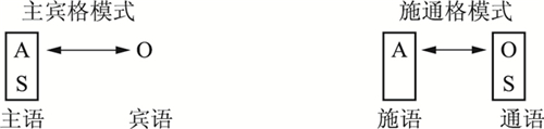 简单说来, 几乎所有语言都区分动作行为的施事和受事(两极), 关键是看不及物动词的当事S跟谁看齐。如果不及物动词的当事跟施事看齐一起构成主语, 那就是主宾格模式。如果不及物动词的当事跟受事看齐构成通语, 那就是施通格模式。类型学上, 以施通格模式为主的语言称之为“施格语言”(ergativelanguage)。之所以叫施格语言, 意思是“施格有标记的语言”(施格比通格更需要标记)。主宾格模式也可称为宾格语言(Accusativelanguage)或受格语言, 意思是通常情况下宾格(或受格)有标记的语言(宾格比主格更需要标记)。①