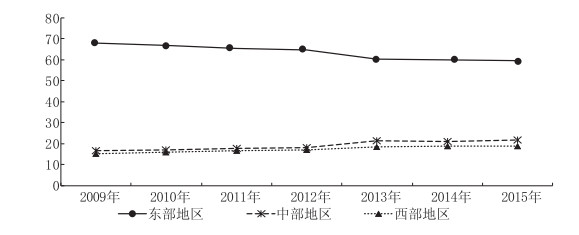 图 2 009—2015年全国农民工的地区分布变化 资料来源:根据2009—2015年全国农民工监测调查报告整理。 |