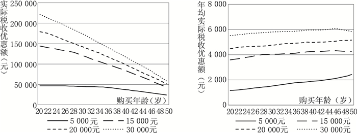 图 1 购买年龄变动情况下实际税收优惠额B(左)和年均实际税收优惠额(右)的变化 |