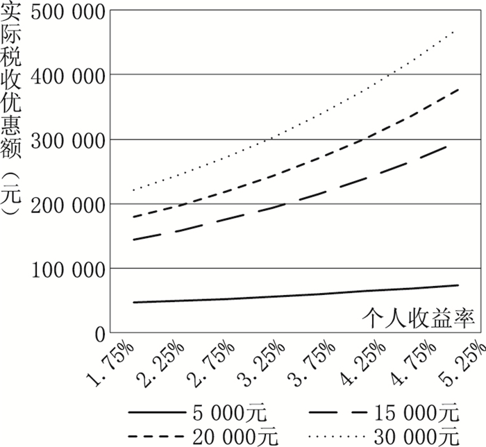 (二) 个人投资收益率r及保险公司预定利率i变动根据实际税收优惠额度的计算公式可知,每期节税金额累积形成的现金流入F1是r的增函数,故实际税收优惠额与r成正比。也就是说,随着个人收益率的增加,税收递延带来的优惠力度更强。通过测算可以发现,对于个人理财收益率越高的群体而言,税延商业养老保险带来的税收优惠越高,与分析结果一致,见图 2。