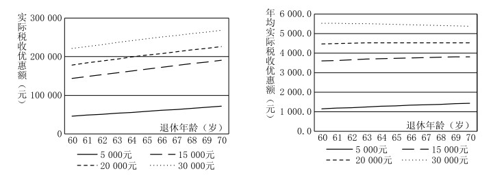 图 4 退休年龄变动情况下实际税收优惠额B(左)和年均实际税收优惠额(右)的变化 |