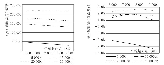 图 5 个税起征点变动情况下的税收优惠额(左)及其增长率(右) |