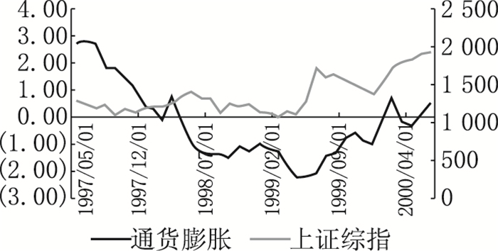 图 1a 低通胀和上证综指走势(1997—2000年) |