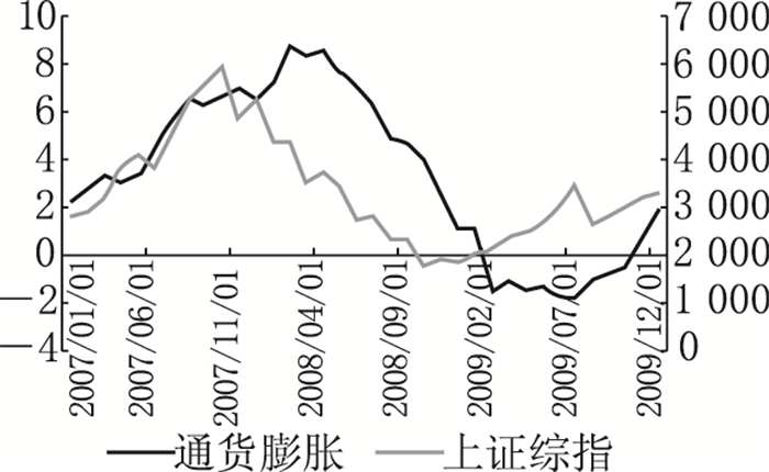2.温和通胀。我们选取了2010年至2011年这一时期作为温和通胀阶段,在此阶段,由图 2可知,CPI有所上升但增速温和,上证综指总体向上攀升,可以看出温和通胀对股票指数有正向作用。在这段时间,一方面产品价格稳定,另一方面名义货币供应量增加使得利率下降,两者都有利于公司盈利能力的提升,从而刺激股票价格的上涨。