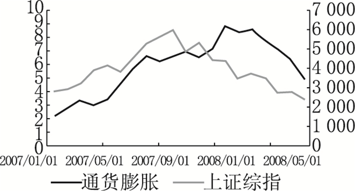 图 3b 高通胀和上证综指走势(2007—2008年) |