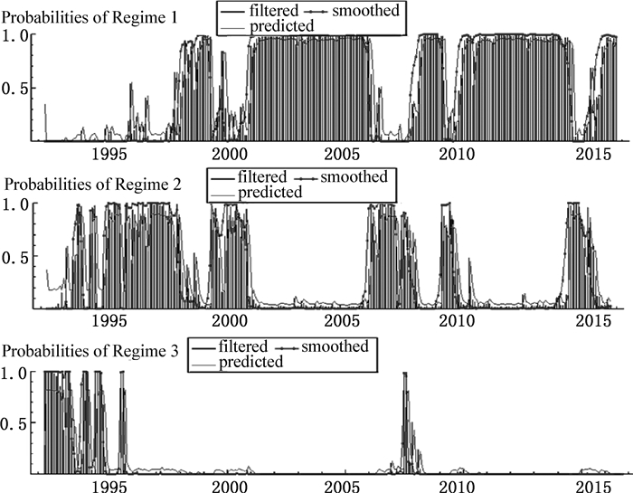 参数估计结果显示,截距项、自回归系数及其滞后项在不同的区制下差异较大,表明我国实际股票收益率与通胀率之间并非一直保持“正相关”或“负相关”的关系,而是随着通胀水平的变化而改变。在区制一情况下,CPI和RSH的截距分别为0.0362、-0.0473;区制二下,CPI和RSH的截距分别为0.1296、0.0249;区制三下,CPI和RSH的截距分别为1.1303、-0.7579。由此我们得出结论:状态s1表示“低通胀率(通货紧缩)和较低实际股票收益率”;状态s2表示“温和通胀和高实际股票收益率”;状态s3表示“高通胀和低实际股票收益率”。可见,参数估计结果验证了前文提出的3个假设。