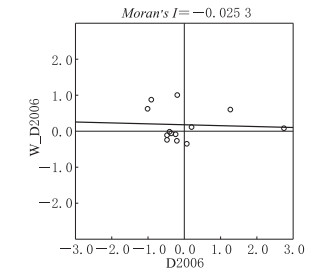 (三) 空间相关分析上文已研究了京津冀“产业—交通—环境”三系统耦合协调度的空间分布,为进一步分析京津冀地区间发展是否存在空间相关性,本文将通过测度三系统耦合协调度的Moran散点图(图 3、图 4)来加以测度。
