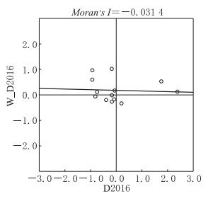 根据Moran指数可以看出,2006年和2016年京津冀地区的Moran指数分别为-0.0253和-0.0314,负相关程度不高,且未通过显著性检验,即京津冀地区“产业—交通—环境”系统的耦合协调度并不存在空间相关性。这与京津冀地区的实际发展情况比较一致。由于在京津冀地区间经济发展过程中,北京占据主导地位,河北省在其发展过程中更多处于被动接受的状态;此外,京津冀地区间交通、环境以及产业系统的协调度不够,加之地区间的协同性不强,导致京津冀地区三系统耦合协调在发展过程中的空间相关性并不显著。这也意味着北京、天津在耦合协调水平达到较高水平阶段的过程中,对周边城市耦合协调度所产生的“涓滴效应”远远不足。未来通过促进北京、天津与河北各城市间产业、交通、环境的协同发展,进而促进系统耦合协调空间相关程度的提高,对京津冀区域系统耦合协调水平的整体提升具有重要意义。