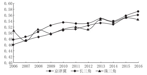 首先,由表 9可知,长三角系统耦合协调度由濒临失调的0.4618提升为勉强协调的0.5615,增幅达21.59%;珠三角系统耦合协调度则由勉强协调的0.5084提高为0.5460,增幅为7.40%,并未实现耦合等级跃迁变化。综合京津冀系统耦合协调度发展趋势可知,研究期内三大城市群系统耦合协调发展水平基本相当,但京津冀和长三角系统耦合协调度的发展速度明显快于珠三角。此外,通过图 5可以发现,研究期内长三角城市群系统耦合水平呈现稳步增长态势,京津冀和珠三角城市群呈现波动增长态势,但总体保持增长趋势。这可能是由于相对于长三角城市群,京津冀和珠三角城市群在工业化快速推进的过程中,粗放的工业生产方式消耗了大量能源且对环境造成严重污染,抑制了“产业—交通—环境”系统的协调发展。而近些年来,各级政府在产业结构调整与产业升级方面采取了一系列措施,不断推进供给侧结构性改革,化解过剩产能,加大对环境的保护力度,进而对区域产业、交通、环境间协调发展关系起到促进作用,“产业—交通—环境”系统耦合协调水平由此在这个过程中表现出明显波动特征。