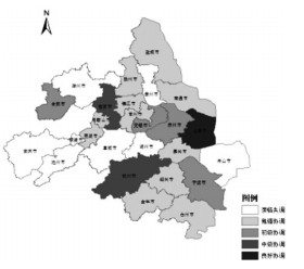 最后,为探索京津冀“产业—交通—环境”系统的协调发展的空间分布,本文根据耦合协调度划分准则,借助ArcGIS软件对京津冀地区三系统耦合协调度进行空间和时序对比。具体结果如图 1和图 2。