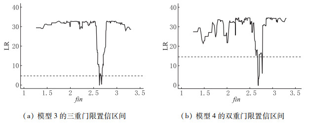 为了判断门限值的有效性,本文借鉴自助抽样法(Bootstrap),通过计算似然比统计量(LR)进行判断,详细的检验信息以门限置信区间图呈现(见图 2)。图中虚线为95%的置信度,曲线是将任意金融发展指数作为门槛值所计算出似然比的连线,与虚线交点表示95%的置信区间,一般根据置信区间的宽度判断门限估计的有效性,置信区间越窄说明门限估计值越准确。由图 2可以看出,模型3和模型4的门限估计值是有效的。