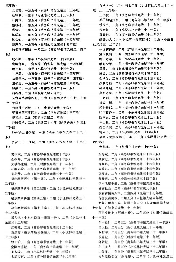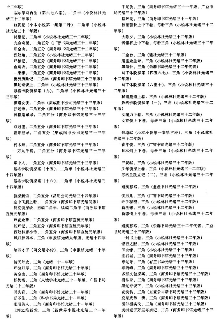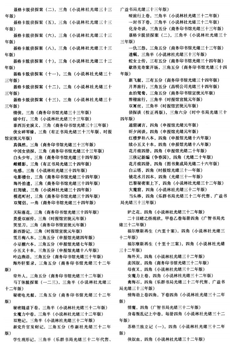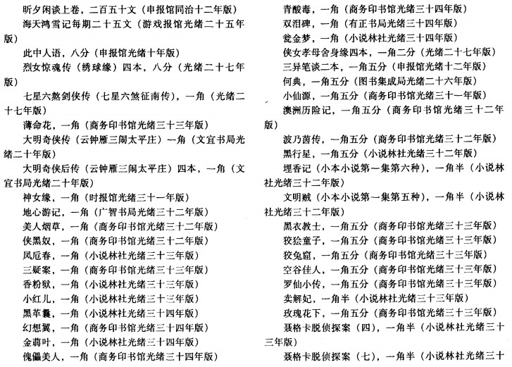 陆士谔在作品的第十回中写道: “在下这部《新上海》, 自己信得过, 没一字虚设, 没一句虚言, 下笔时千斟万酌, 调查详细, 博访再三, 盖欲把此书成一部信史”。他笔下关于小说的种种叙述实为当时人所作的记录, 是相当可信的。他在第十六回里还让主人公梅伯看到这样一幅景象: 广智书局出版的《明治政党史》、《十九世纪外交史》、《社会主义》、《戊戌政变记》等书, “见旁人买时都只得两三个铜元一册, 翻那书上价目, 却明明白白刊着一元、八角、五角、三角呢”。他“心里很是纳罕”, 雨香向他解释说: “这种书, 原没有小说的有用, 自然没有人要瞧他了。……从前没有新小说的时候, 自然还有人买来瞧瞧, 这会子人家不会省几个钱去买小说呢, 所以这书局就把这许多书, 当着废纸秤担儿卖出来, 怎么会不贱?”这段描述所透露的信息, 是当时新小说风行后, 已相当地挤压了其他书籍的市场, 而小说易销这一事实, 又必然促使已有的书局更多地将资金投入小说的出版, 同时社会上又会产生更多新的出版小说的书局, 这意味着小说市场的竞争变得十分激烈, 其结果则是加快形成较稳定的小说价格体系。所谓“稳定”, 并非是价格固定不变, 而是指价格接近于价值, 它的表现之一, 便是各书局的小说书价达到一个基本平衡的状态, 如人镜学社光绪三十一年版的《怪獒案》与广智书局光绪三十二年版的《怪獒案》, 定价就都是三角, 本文所附的近500种晚清小说的书价, 也可以帮助我们了解这一点。