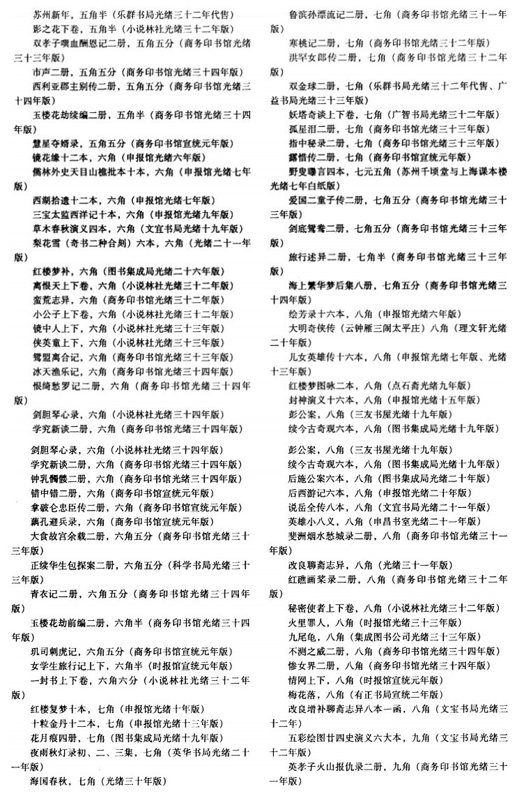书局为小说销售而设计的手段五花八门, 而这些活动隐含的意义却是读者嫌小说书价的过贵。吴趼人刚到上海做小职员时, 一个月的收入只有八元, 黄警顽在《我在商务印书馆的四十年》里写道, 他清末进馆做学徒时, “馆方除供应食宿外, 每月发给零用钱两元”, 这些人在当时上海相当多, 他们显然是买不起小说的。正是在这样的背景下, 陆士谔于宣统元年写成的《新上海》第九回中, 就有当时读者对书价贵的埋怨。当雨香对新小说大加称赞之时, 魏赞营说道: