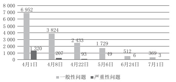 (三) “人文素养家园共育共治”项目的实践效果从上可见,人文共治项目体现了人文治理的核心理念。那么,立德树人的最终实效到底如何?下面图表分别以包钢集团和大庆市实验基地的部分数据为例,展示了在面对不良品行问题(区分为“一般性问题”和“严重性问题”)时,人文共治项目实施前后给儿童带来的变化。一方面,在图 2中,4月1日是项目前测点,而7月1日则是项目开展三个月之后的后测点。可以看出,从项目实施第一周起,就取得了立竿见影的效果,儿童的一般性问题和严重性问题都开始大幅下降,截止到项目结束,累计改正孩子7 900个不良品行问题,问题丢掉率高达95.5%。另一方面,大庆市人文共治项目还添加了未进行人文共治项目的对照组数据,从而更有利于比较、观测项目实施的效果。表 2显示,在同一时间段,在未进行项目试点、采取传统教育方式的幼儿园,儿童不良问题虽有所改善,但效果不佳,问题减少率不到10%。而在同期的实验组中,虽然最初人均存在的问题数要高于对照组,但不良问题的减少速率明显提升,达到对照组的5倍以上,降幅高达51.9%。由此可见,人文共治项目极大提升了教育效果。