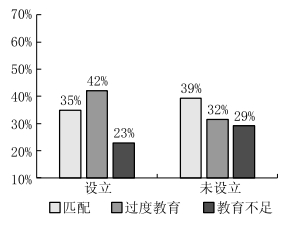 图 3和图 4给出了设立开发区和未设立开发区区县的就业匹配的统计情况。整体来看,两组区县的平均就业匹配情况没有出现显著差异,设立开发区区县的就业市场的平均不匹配程度为2.85年,略高于未设立开发区区县的2.83年。从就业匹配的组成结构来看,在设立开发区的区县,过度教育现象明显更加严重,而教育不足的就业占比要略低于未设立开发区的区县。上述统计结果反映出开发区与就业教育匹配程度之间的负向关系,与本文的研究预期并不一致,这可能是由开发区选址与地区教育水平之间可能存在的内生性问题导致的。例如,教育资源更加丰富的地区更容易出现过度教育问题,但同时也更加有利于开发区的设立和吸引高新技术产业进入。在后续实证分析部分,本文将通过更加严谨的计量模型分析来识别开发区设立与就业匹配之间的因果关系。