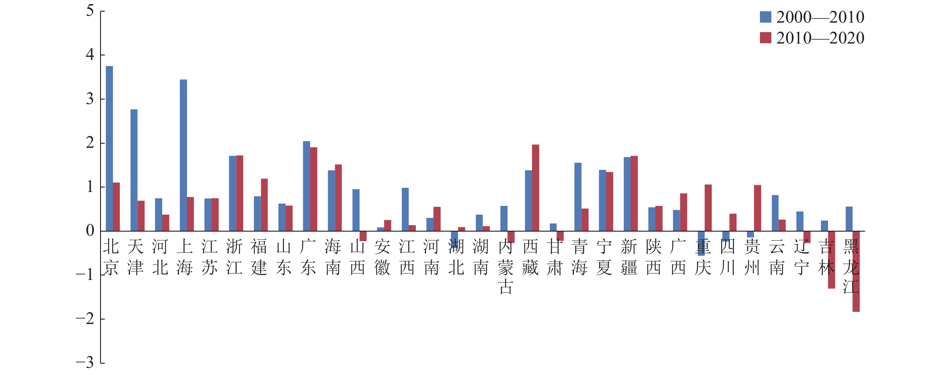 | 图 1 各省市人口年均增长率 资料来源:全国第五、六、七次人口普查。 |