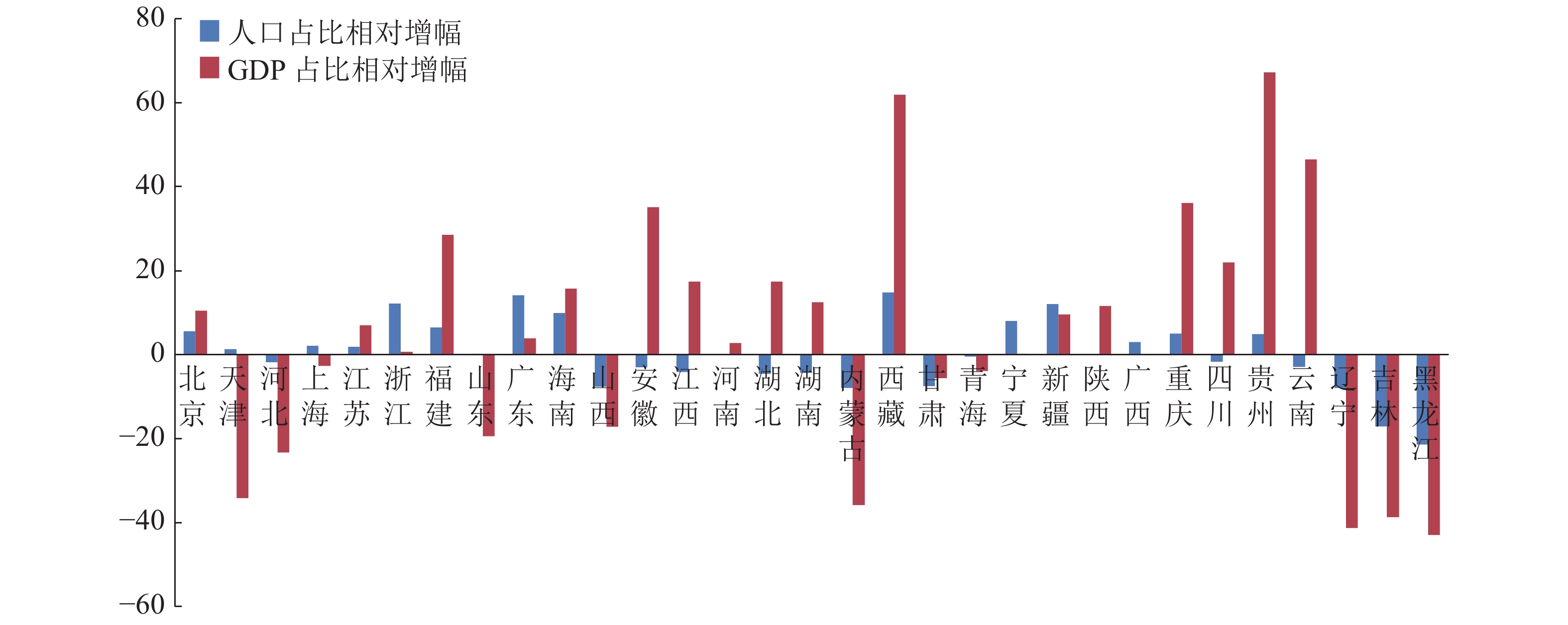 | 图 4 2010—2020年各省人口与GDP占比的相对增幅 单位 % 资料来源: 2018、 2019 年数据根据中国统计年鉴, 2020 年根据第七次人口普查。 |